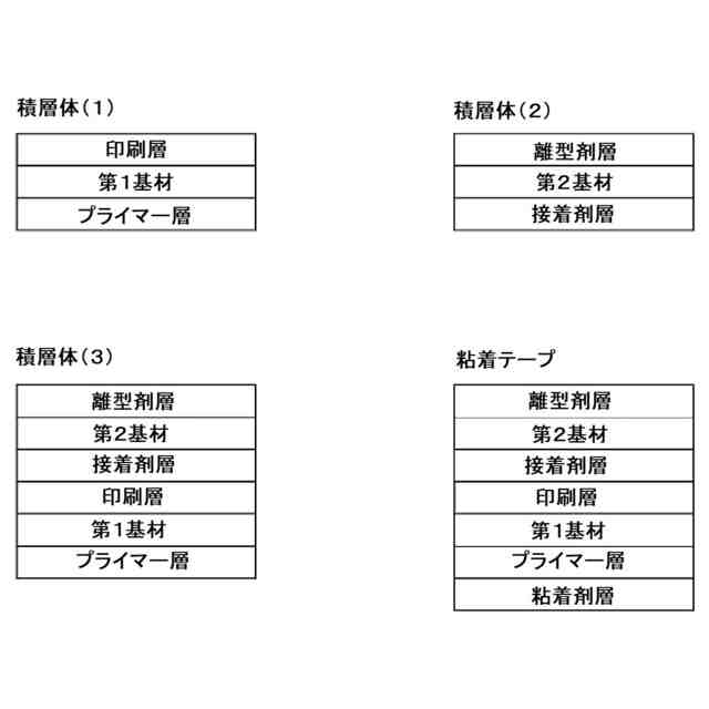 (4)粘着剤層と第1基材の間にプライマー層が配置されており、印刷層と第2基材の間に接着剤層が配置されており、第2基材の接着剤層が存在しない側に離型剤層が配置されていることを特徴とする、(1)又は(2)に記載の粘着テープ。
