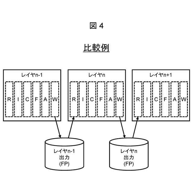)を使用しているため、整数で畳み込み処理を行った場合、畳み込み処理の処理結果(整数)を用いて活性化関数を計算することができず、畳み込み処理の処理結果を浮動小数点数に変換してから活性化関数を計算する必要がある。従って、上記第1の比較例と上記第2の比較例を組み合わせるためには図4に示した処理内容とする必要がある。レイヤn-1、レイヤn、レイヤn+1の処理はそれぞれ、一つ前のレイヤの出力をメモリから読み出し、整数化処理、畳み込み、FP化(=浮動小数点化)、活性化関数処理を順次行って、結果をメモリに書き込む。ここで、メモリに格納されるデータ(レイヤn-1出力(FP)、レイヤn出力(FP))は浮動小数点数となる。ニューラルネットワークの処理において、畳み込み演算を整数で行うことにより浮動小数点数で畳み込みを行った場合に比べて畳み込み演算の処理時間を削減した場合、メモリの読み書きの処理時間の比率が相対的に大きくなる場合が多い。図4の処理内容の場合、メモリに格納されるデータは浮動小数点数であるため、メモリに読み書きされるデータのデータ量は第2の比較例と変わらず、この点で、第1の比較例と組み合わせたことによる高速化の効果は限定的である。