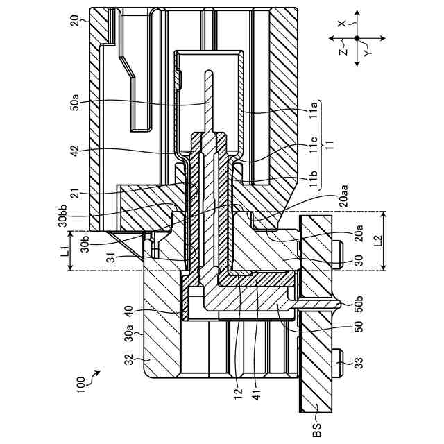 図1から図14を参照して、実施形態について説明する。図1は、実施形態に係るコネクタを示す斜視図、図2は、実施形態に係るコネクタを示す断面図、図3は、実施形態に係るコネクタを示す分解斜視図、図4は、実施形態のアウタ端子を示す斜視図、図5は、実施形態のアウタハウジングを示す斜視図、図6は、実施形態のシールドシェルを示す斜視図、図7は、実施形態に係るコネクタの製造方法を示すフローチャート図、図8は、実施形態のアウタ端子挿入工程を示す斜視図、図9は、実施形態のアウタ端子挿入工程を示す断面図、図10は、実施形態のアウタ端子挿入工程を示す平面図、図11は、実施形態のインナ端子挿入工程を示す斜視図、図12は、実施形態のインナハウジング収容工程を示す斜視図、図13は、実施形態のインナハウジング収容工程を示す断面図、図14は、実施形態に係るコネクタを基板に取り付ける態様を示す斜視図である。なお、図2は、図1に示すA-A線における断面図であり、図9及び図13は、図10に示すB-B線における断面に対応する断面図である。