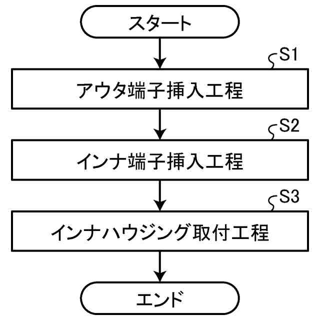前記インナハウジング収容工程において、前記インナハウジングは、前記本体部を前記アウタ端子の係止片側から前記筒状部に挿入され、前記垂下部と前記第2貫通孔の縁部との間に前記係止片を挟み込むことを特徴とする、