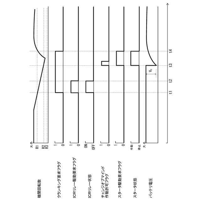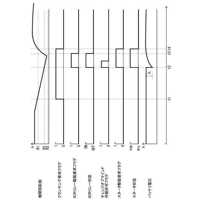 【解決手段】内燃機関1は、スタータモータ2が駆動(始動)するタイミングでバッテリ4からスタータモータ2に供給する電力の供給経路を第1経路に切り替える。すなわち、内燃機関1は、自動再始動条件が成立してクランキング要求フラグが「1」となり、かつ内燃機関1の機関回転数がスタータモータ始動可能回転数R2まで低下したタイミングでICRリレー駆動要求フラグを「0」から「1」に切り替える。