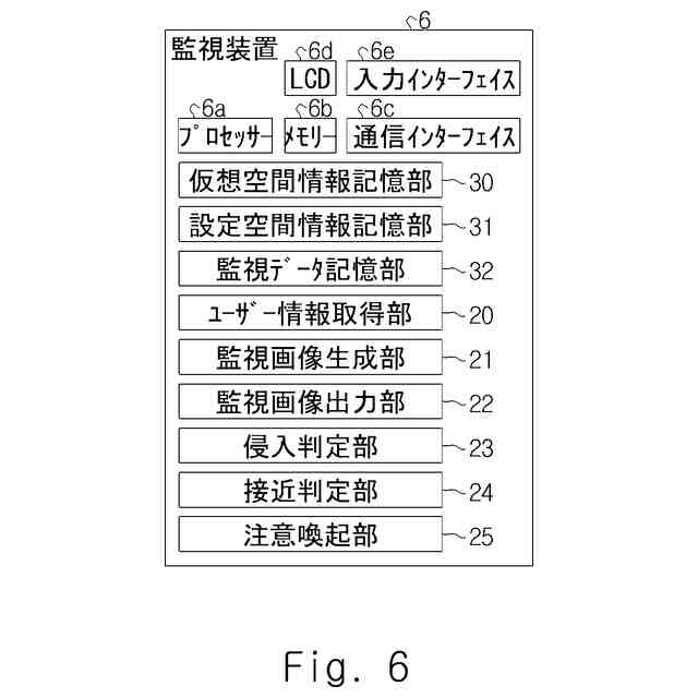 【解決手段】現実空間を再現した仮想空間と、前記現実空間に存在する複数の作業員と、を表示装置に出力する出力手段と、前記複数の作業員のうち少なくとも何れか一人の、前記仮想空間内で設定された設定空間からの離間距離が第1の所定値未満であるとき、前記表示装置を介して前記複数の作業員を監視する監視者に対して注意喚起する注意喚起手段と、を含む、監視システムが提供される。