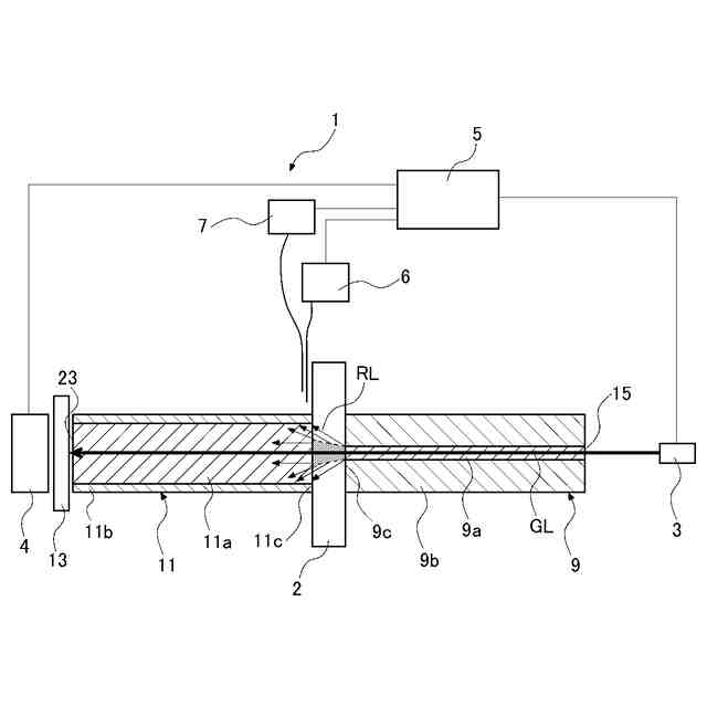 まず図1を参照して本発明の第1の実施形態に係る光ファイバ型センサの概略を説明する。図1は、本発明の第1の実施形態に係る光ファイバ型センサ1の概略を示す図である。図1では光ファイバ型センサ1として、周囲の磁場強度を測定するセンサを例示している。図1に示す光ファイバ型センサ1は光源3、第1光ファイバ9、ダイヤモンド基板2(素子)、光検出器4(計測部)、及び第2光ファイバ11を備える。光ファイバ型センサ1は、波長選択フィルタ13、マイクロ波照射器6、磁場発生器7、及び制御部5も備える。