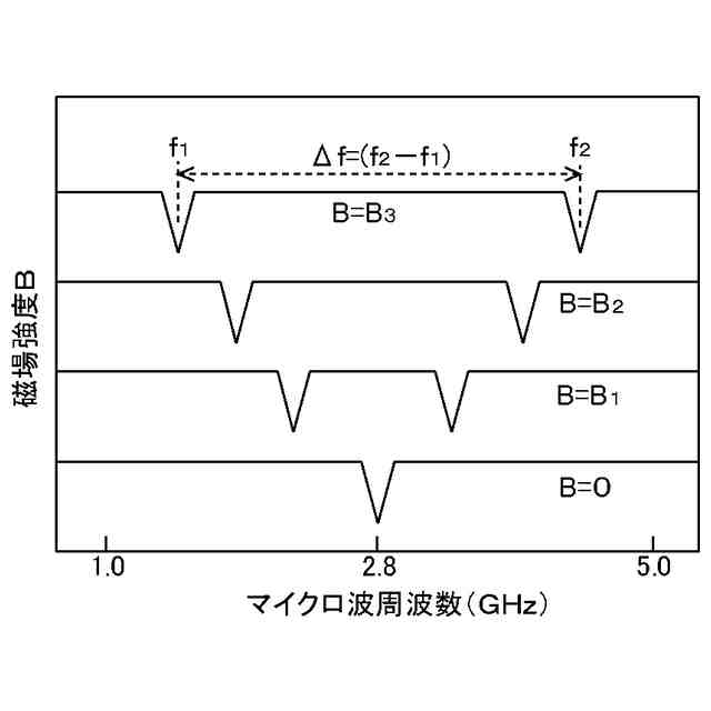 =±1は外部磁場強度に比例してゼーマン分裂するため、赤色光強度の低下点の周波数から外部磁場強度を検出できる。