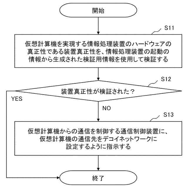 本開示の一態様に係るプログラムは、仮想計算機を実現する情報処理装置のハードウェアの真正性である装置真正性を、前記情報処理装置の起動の情報から生成された検証用情報を使用して検証する装置検証処理と、前記装置真正性が検証されない場合に、前記仮想計算機からの通信を制御する通信制御装置に、前記仮想計算機の通信の相手を、前記仮想計算機の接続先を模倣するデコイネットワークにするように指示する制御指示処理と、をコンピュータに実行させる。