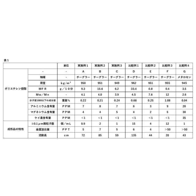 、MFRが1.0~50g/10分、Mw/Mnが3.0~6.0、分子量1000以下の成分が0.30重量%以下、アルミニウム含有量がポリエチレン樹脂に対して10PPM以下、マグネシウム含有量がポリエチレン樹脂に対して10PPM以下、ケイ素含有量がポリエチレン樹脂に対して1PPM以下のポリエチレン樹脂。