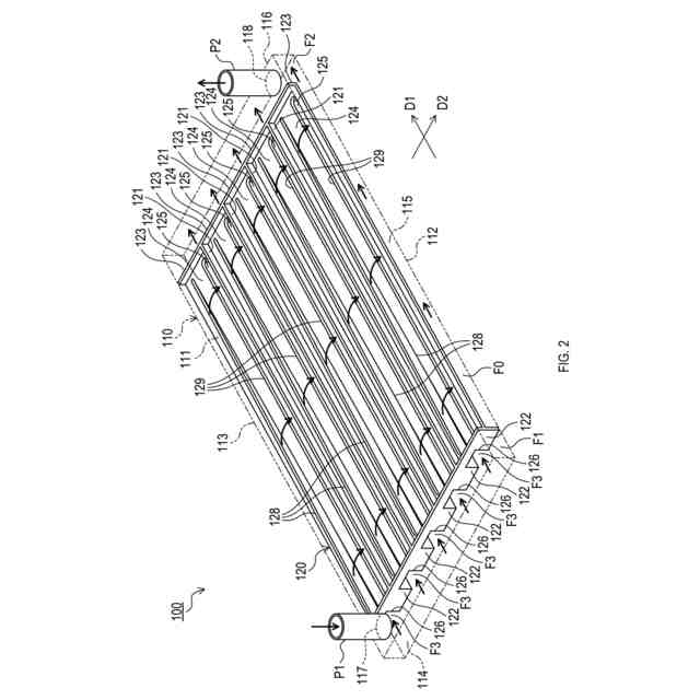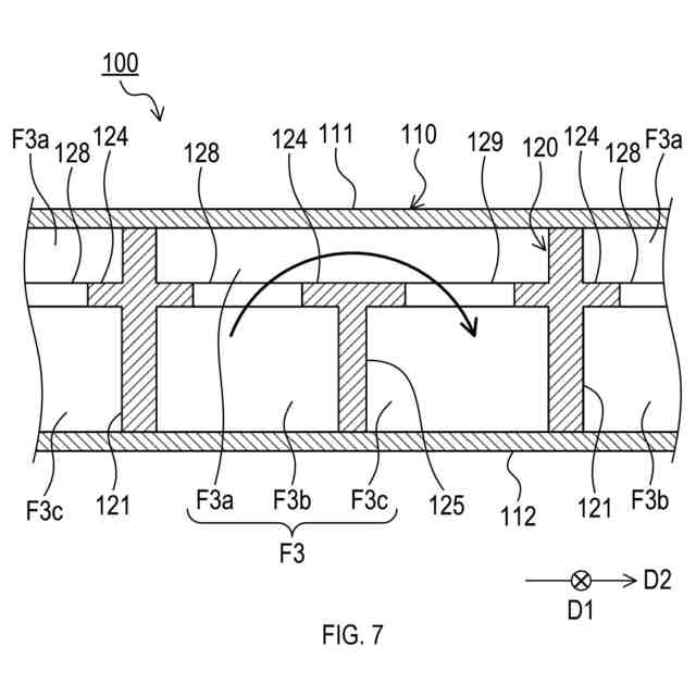 前記第1仕切り部及び前記第2仕切り部は、前記流通部を、前記第1板部側の第1領域と、前記第1仕切り部を挟んで前記第1領域に隣り合うとともに、前記第2仕切り部を挟んで互いに隣り合う、前記第2板部側の第2領域及び第3領域と、に仕切り、