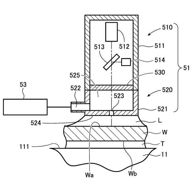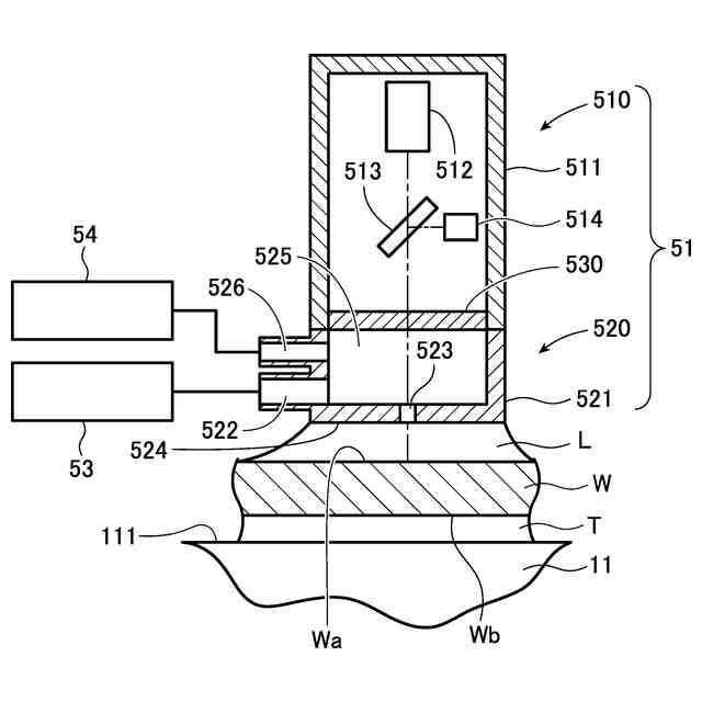 第1の実施形態に係る研削装置が備える非接触厚み測定器の断面模式図である。
