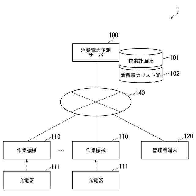 図1は、実施形態に係る消費電力予測システムのネットワーク構成の一例を示す図である。図1に示すように、消費電力予測システム1は、消費電力予測サーバ100と、複数の作業機械110と、充電器111と、管理者端末120とを備える。消費電力予測システム1は、建設現場や採石場などの作業機械110が作業する作業現場に導入される。消費電力予測システム1は、作業機械110が搭載する蓄電池の消費電力を予測する。