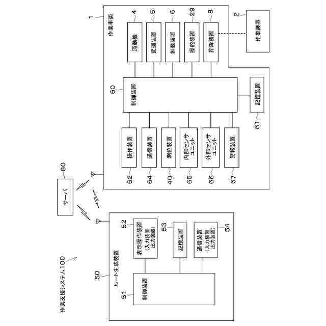 また、本発明の作業支援装置は、圃場で前記作業車両と前記作業装置により前記作業を行うことを支援する作業支援システムであって、前記入力ルート装置と前記制御装置とを備えている。さらに、本発明のルート作成方法は、圃場で作業車両と前記作業車両に装備された作業装置により作業を行うためのルートを生成するルート生成方法であって、入力装置によって前記作業に関する作業情報を入力するステップと、制御装置によって前記圃場に関する圃場情報と前記作業情報とに基づいて、前記圃場の複数の領域にそれぞれ前記作業車両と前記作業装置により前記作業を行う複数の作業ルートを作成するステップと、前記制御装置によって複数の前記領域の作業順に応じて、前記作業車両により前記作業装置を複数の前記作業ルートへ順次移動させる複数の移動ルートを作成するステップと、を備えている。