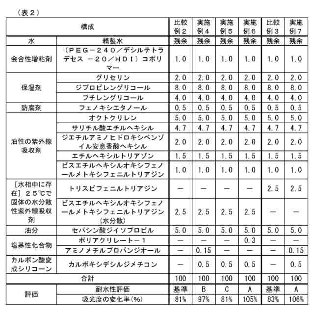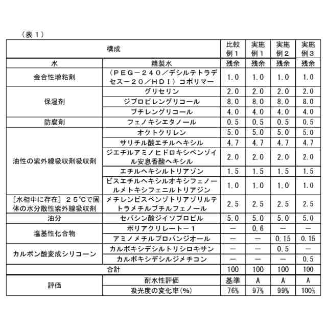 サンケア製品に使用されうる紫外線防御剤として、水分散性紫外線吸収剤が知られている。しかしながら、水分散性紫外線吸収剤を配合している化粧料は、高い紫外線防御効果を示せる一方で、耐水性が劣っているという課題がある。