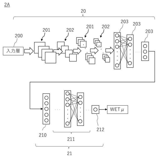タイヤの接地面の接地圧分布と、前記タイヤの溝深さと、前記タイヤを構成するゴム部材の粘弾性とを含む第1データと、前記タイヤのウェット路面における摩擦係数の実測値を含む第2データとが組み合わせられたデータセットを複数含む学習用データセットを記憶する記憶部と、