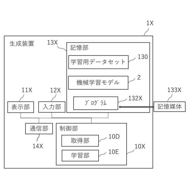 前記第1データを機械学習モデルに入力し、前記機械学習モデルからの出力データを導出するとともに、前記出力データと前記第1データに組み合わせられている前記第2データとの誤差が小さくなるように前記機械学習モデルを定義するパラメータを調整する学習部と
