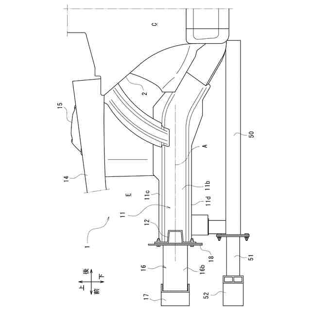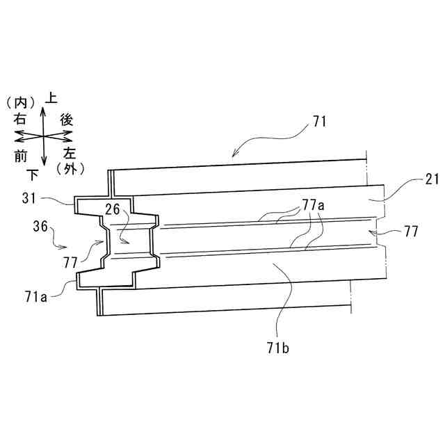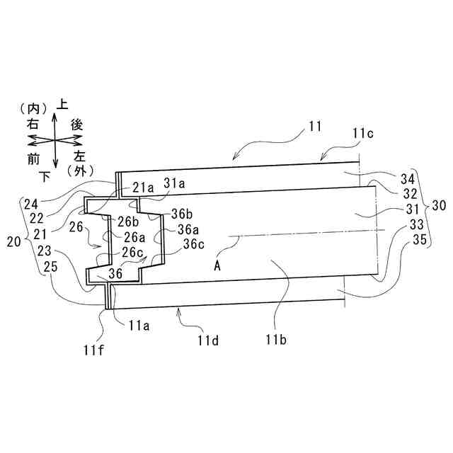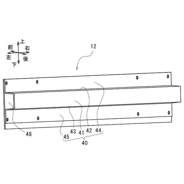 前記クロス後壁部と、前記クロス上壁部と、前記クロス下壁部と、前記クロス上壁部の前縁から上方に延びるクロス上フランジ部と、前記クロス下壁部の前縁から下方に延びるクロス下フランジ部とを含む、クロス本体部と、