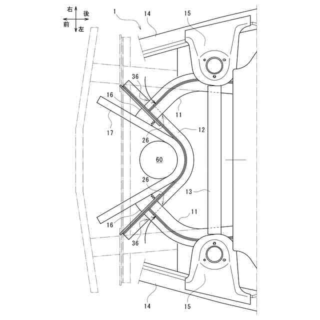 ポール前突時における車両の前部構造の変形態様を概念的に示す平面図。