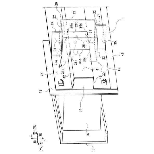 前記クロスメンバは、前記両側部分が左右の前記外壁部それぞれにおいても前記凹部に対して前方より嵌まり込んで固定されている、