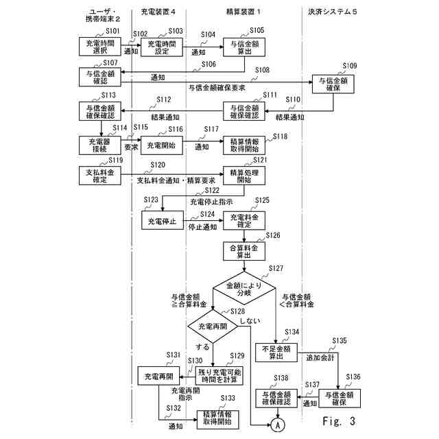 前記与信金額が前記合算料金よりも多い場合、前記与信金額と前記合算料金との差額より算出された残り充電可能時間に基づいて、前記車両用充電装置に対して、充電再開の指示をする、請求項2に記載の精算装置。