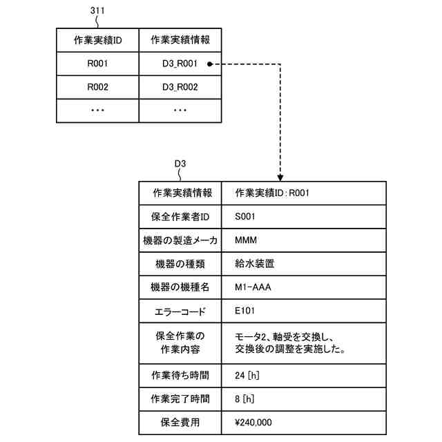 前記保全作業を実施した前記保全作業者を示す保全作業者識別子と、前記保全作業が実施された前記機器である保全実施機器の製造メーカ、種類、機種名、前記保全実施機器で発生した異常の種別を示すエラーコードのうち少なくとも1つと、前記異常が発生してから前記保全作業を開始するまでの作業待ち時間、前記保全作業を開始してから完了するまでの作業完了時間、前記保全作業に要する保全費用のうち少なくとも1つとを含み、