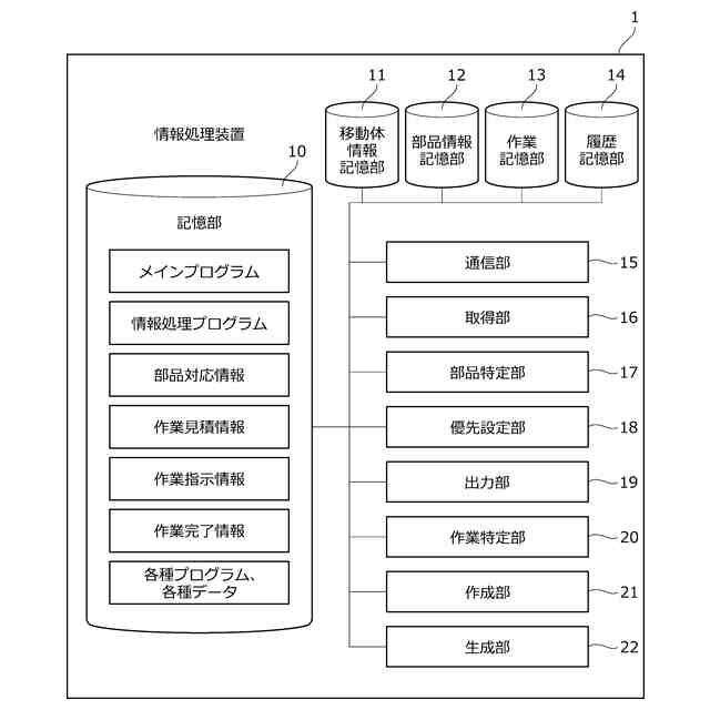 また前記課題は、本発明の情報処理プログラムによれば、移動体を識別する移動体識別番号と前記移動体を識別する型式指定番号及び類別区分番号の組み合わせとを、前記移動体を構成する部品の情報と対応付けて記憶する記憶部を有する情報処理装置としてのコンピュータに、所定の移動体における前記移動体識別番号と、前記型式指定番号及び類別区分番号の組み合わせとの少なくとも一方の情報を取得する処理と、得られた前記移動体識別番号と、前記型式指定番号及び類別区分番号の組み合わせとの少なくとも一方の情報をもとに、前記記憶部に記憶される前記少なくとも一方の情報に対応付けられた所定の移動体を構成する部品を特定する処理と、特定された部品の情報を出力する処理と、を実行させ、前記部品を特定する処理では、前記移動体識別番号の情報、または前記型式指定番号及び類別区分番号の組み合わせの情報を取得したことにより、取得したいずれかの情報をもとに前記部品を特定し、前記移動体識別番号の情報と前記型式指定番号及び類別区分番号の組み合わせの情報とを取得したことにより、両方の情報のうち優先設定がなされた一方の情報をもとに前記部品を特定すること、により解決される。