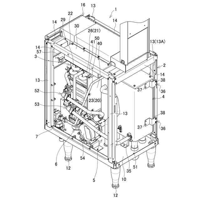 筐体2は、底板10と、天板11と、4本の脚12,12・・と、4本の縦フレーム13,13・・と、4本の横フレーム14,14・・と、4枚の外パネル15,15・・とを含んでなる。底板10は、平面視矩形状で、四辺がそれぞれ上向きに折り返されている。各脚12は、底板10の下面四隅で下向きに取り付けられて底板10を水平に支持している。各縦フレーム13は、底板10の折り返し部に固定されて底板10の四隅に立設されている。各横フレーム14は、前後左右に隣接する縦フレーム13,13の上端間に架設されている。天板11は、横フレーム14,14・・に取り付けられて筐体2の上面を閉塞している。天板11の上面には、熱源ユニット3の後述する排気部22に接続される排気ダクト16が設けられている。