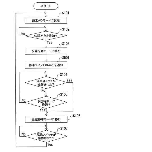 前記制御部は、前記検知部で乗員の体調不良が検知されてから前記予想時間が経過するまでの間に、前記停車スイッチが操作されなかった場合、前記車両を路肩に停車させる停車制御を開始する