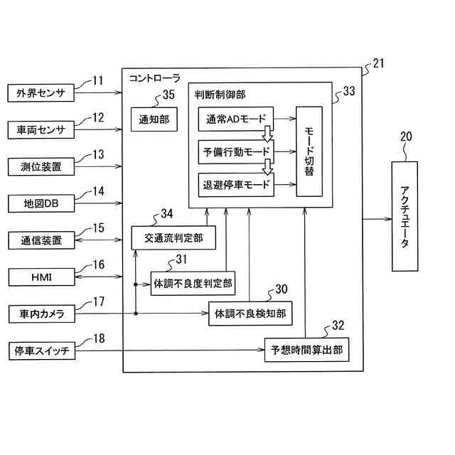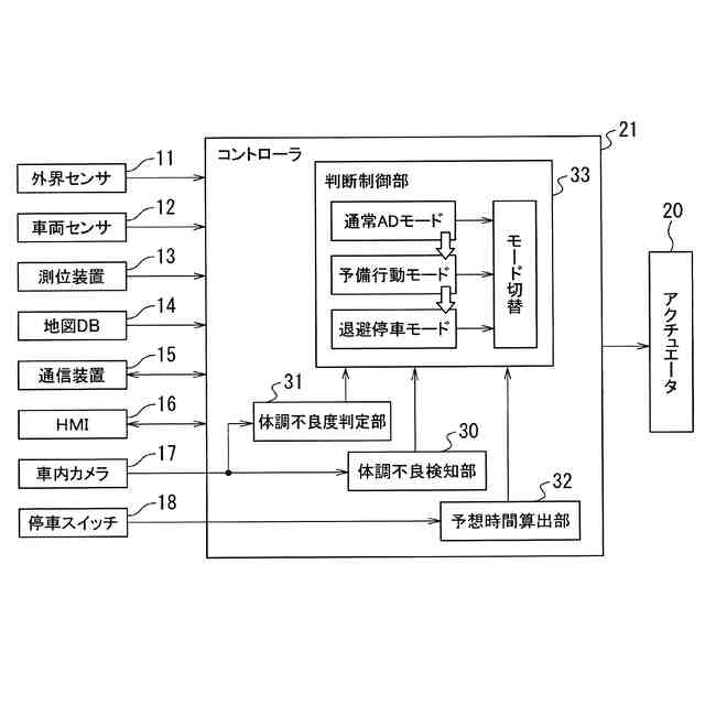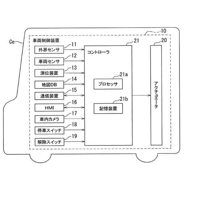 車両制御装置10は、外界センサ11と、車両センサ12と、測位装置13と、地図データベース(DB)14と、通信装置15と、ヒューマンマシンインタフェース(HMI:Human Machine Interface) 16と、車内カメラ17と、停車スイッチ18と、解除スイッチ19と、アクチュエータ20と、コントローラ21とを備えている。