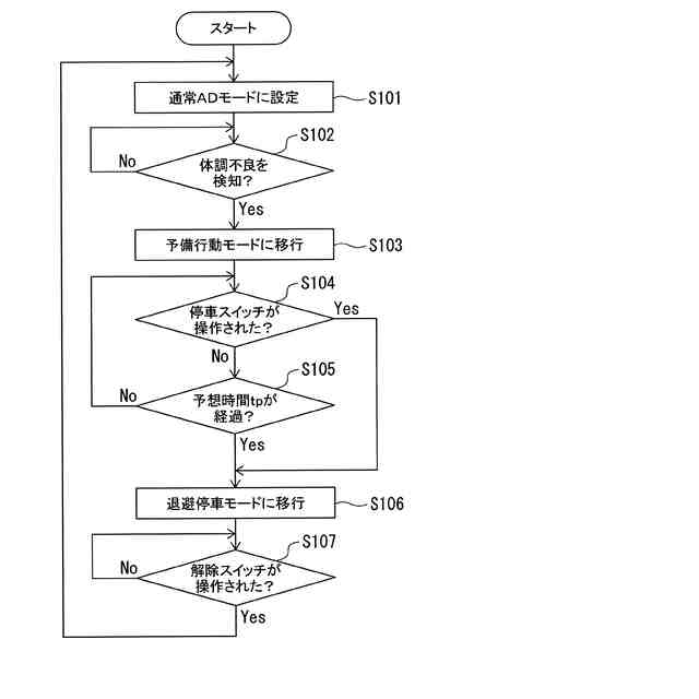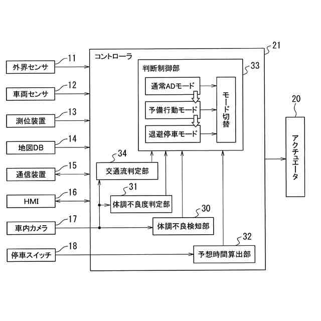 【解決手段】 体調不良検知部30は、乗員の体調不良を検知する。また、体調不良度判定部31は、体調不良が検知された乗員の体調不良の度合いを判定する。また、予想時間算出部32は、体調不良の度合いに基づき、乗員の体調不良が検知されたときから、乗員によって停車スイッチ18が操作されるまでに要する時間である予想時間を算出する。また、判断制御部33は、目標経路に従った自律走行の実行中乗員の体調不良が検知されると、その自律走行を継続しつつ、予想時間の経過前に、路肩に隣接する車線である路肩隣接車線に車両を車線変更させる予備行動制御を開始する。