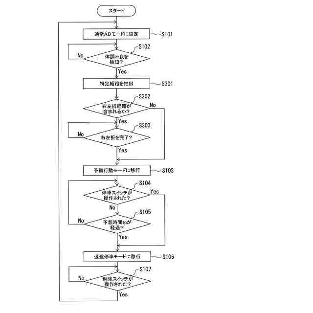 前記制御部は、前記目標経路から、前記検知部で乗員の体調不良が検知されてから前記予想時間が経過するまでの間に前記車両が走行する経路である特定経路を抽出し、抽出した前記特定経路に交差点を右左折する経路が含まれるかを判定し、交差点を右左折する経路が含まれると判定した場合には、交差点の右左折を完了した後に、前記予備行動制御を開始する