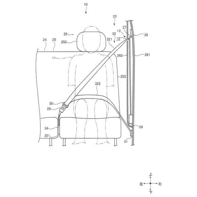 シートベルトは、自動車や航空機などの座席に付いているベルトであり、身体を座席に固定し、衝突事故などの際に身体が投げ出されることを防ぐベルト状の部材である。シートベルトは、乗員の身体の肩口から腰にかけて掛け渡され、上方側端部が車体側に固定され、下方側端部がシート側に固定される。