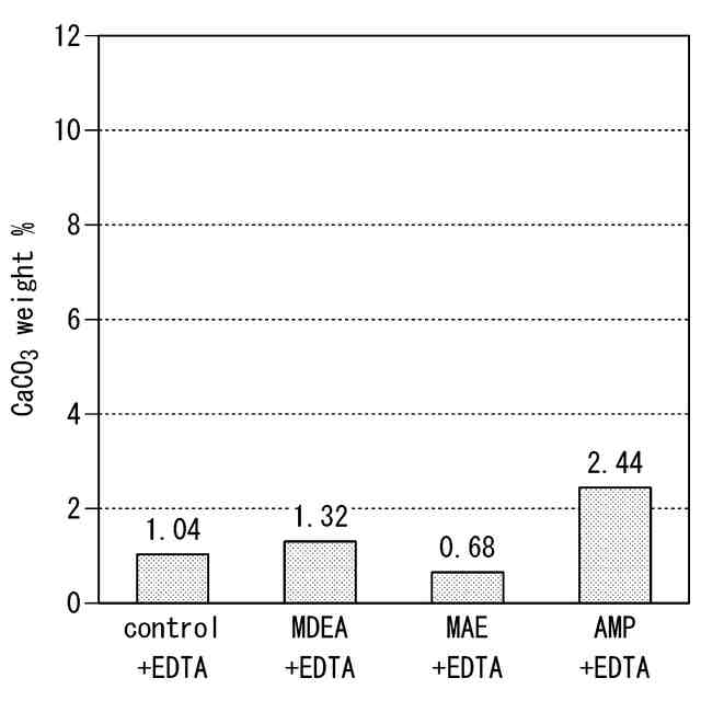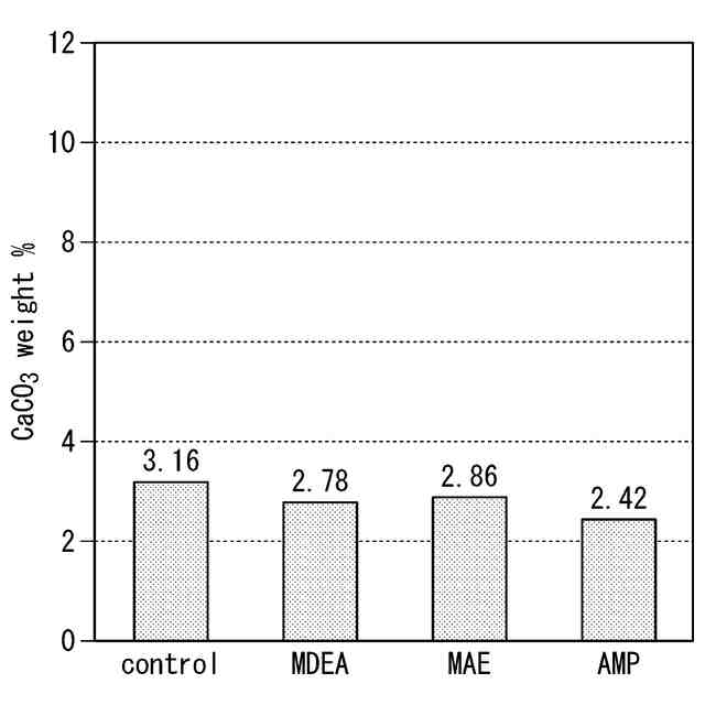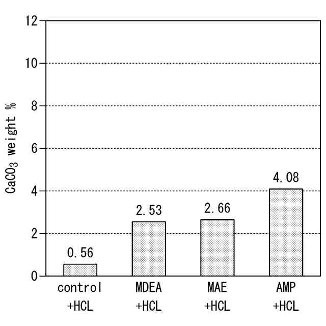 実験例3において、アミン系化合物の種類と炭酸カルシウムの生成量の関係を示す図である。