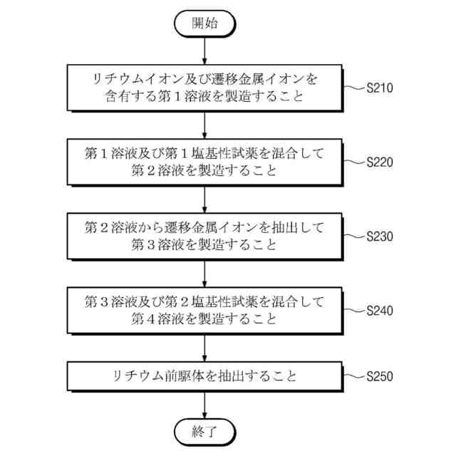 正極活物質水洗工程で発生した廃液からリチウム前駆体を回収する方法もまた様々な態様で実施されている。正極活物質を水洗する時に発生する廃液には大量のリチウムが含まれている。しかし、従来の方法は前記廃液からリチウム前駆体を回収するために別の単独工程を必要とする問題点を有している。また、通常回収率が100%である工程はないため、別の単独工程を作ること自体でリチウムの損失が必然的に発生するという問題点も有している。したがって、改善されたリチウム前駆体回収方法が必要である。