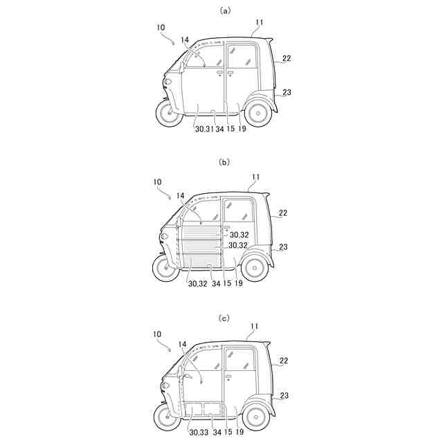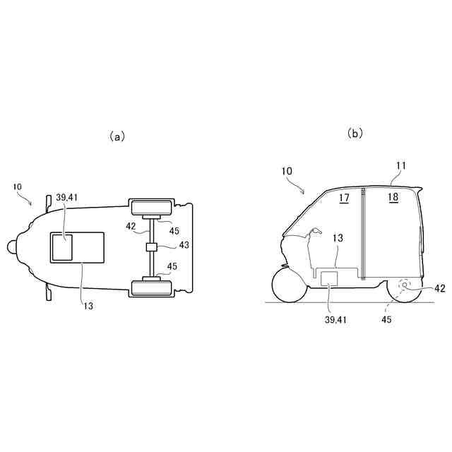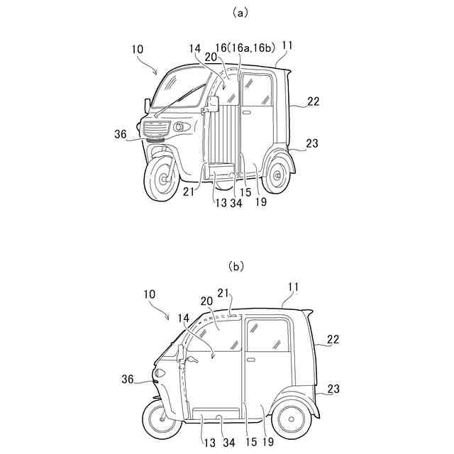 一方、本発明の電動式ルーフ付きトライクは、二輪自動車(側車付二輪自動車を含む)施行規則の全長2.5m以下、全幅1.3m以下、全高2.0m以下において形成される。