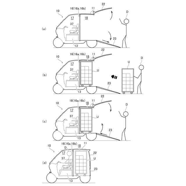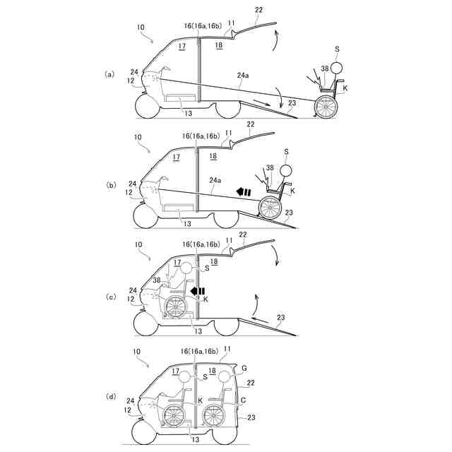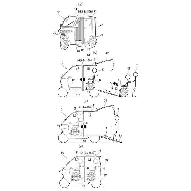 しかしながら、係る「車椅子用三輪車両」(特許文献-1)の提案は、車椅子用の三輪車両としているが、構造的には、四輪のワンボックスカーの形状を有して形成されており、運転席の横に助手席が設けられている。車体の前方部にエンジン駆動部が配置されている。後部乗車口から運転席までの移動経路が直線的でなく、また必要以上に移動距離が長い。車椅子の設置形態が跨がり式の座席構成ではない。乗車口の設置個所が運転席の側方の位置に解放されていない等、道路運送車両法の側車付二輪自動車の法的仕様基準に準じた形状に製作されていないものであり、加えて本発明の電動式ルーフ付きトライクと比して運転席スペースとラゲッジスペースを分離する隔離壁が設けられていないことや、前輪が二輪であることから操舵構造が複雑であるといった相違点があるものであった。
