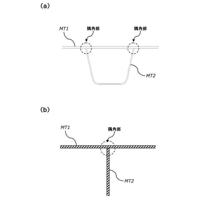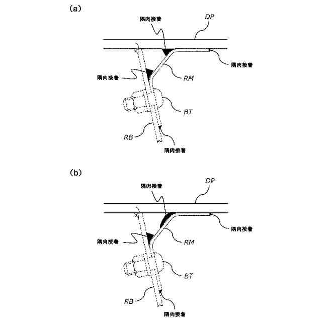ここまで、橋梁の鋼床版におけるデッキプレートDPと縦リブRBとの接合部の例で説明してきたが、引用文献1の内側補強材RMは、鋼床版に限らず2つの部材が接合される「隅角部」を補強することができる。そして、その隅角部に内側補強材RMを接着固定するにあたっては、やはり図8(b)に示すように好ましくない接着形状が生じることは避けられない。