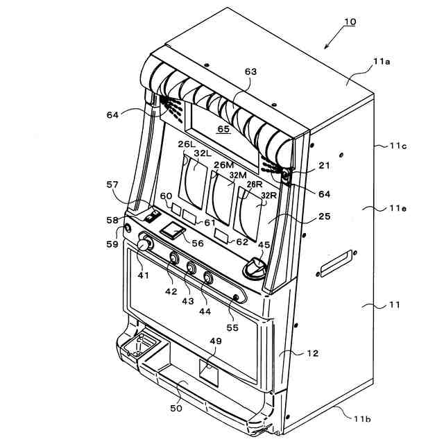 前面扉を開いた状態を示すスロットマシンの斜視図。