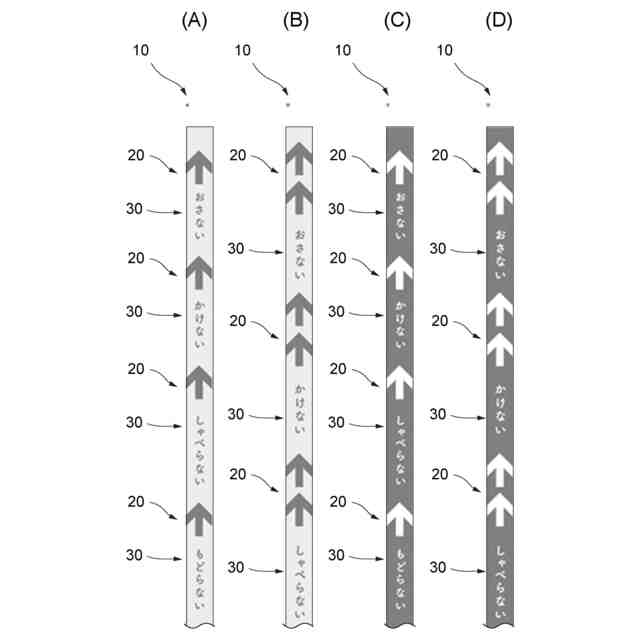 上記のごとき経路表示用テープにおいて、複数種類の単語を表す文言が周期的に配置されていてもよい。