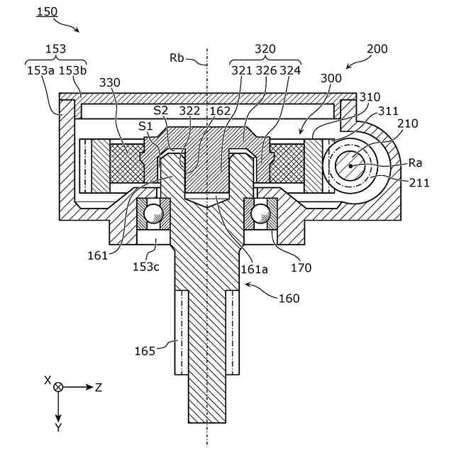 前記第二軸部は、前記第一軸部の径方向の外側を囲むように配置された筒状の部位であり、かつ、外周面に前記環状歯部が固定されており、