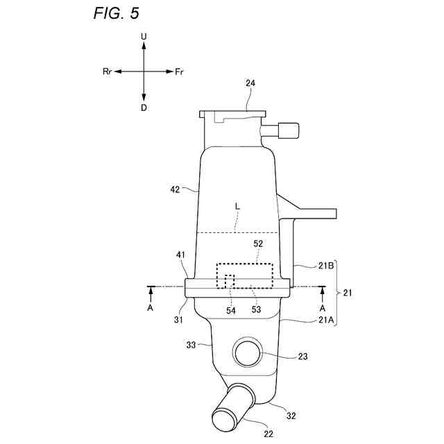 以下、本発明の冷却液タンクの一実施形態を、添付図面に基づいて説明する。なお、以下においては便宜上、冷却液タンクを車両に搭載した姿勢で方向を特定し、車両の前方をFr、後方をRr、左方をL、右方をR、上方をU、下方をD、として示す。ただし、冷却液タンクを車両に搭載する姿勢は様々であり、図面に示す方向に限られない。