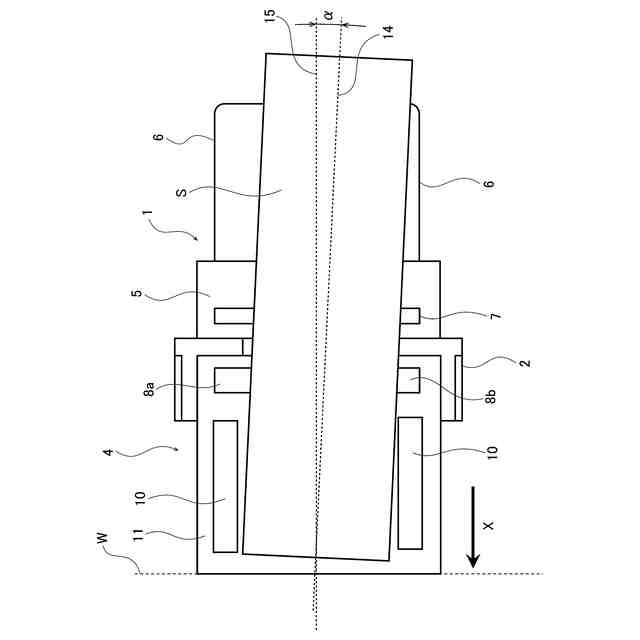 本発明の実施の形態1に係るシート給送装置のシートが給送方向に対して斜めに積載された状態の平面模式図である。