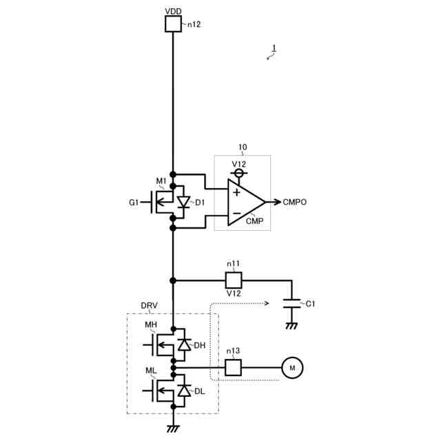 トランジスタM1のドレインとダイオードD1のカソードは、ノードn11に接続される。トランジスタM1のソース及びバックゲートとダイオードD1のアノードは、ノードn12に接続される。トランジスタM1のゲートは、ゲート電圧G1の印加端に接続される。トランジスタM1は、ノードn11とノードn12との間に接続されたトランジスタとして理解され得る。また、ダイオードD1は、トランジスタM1に付随するボディダイオードとして理解されてもよい。
