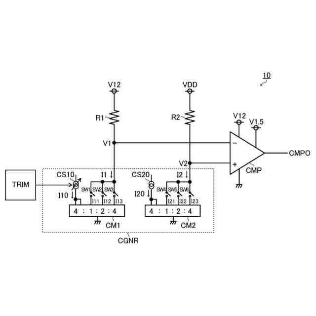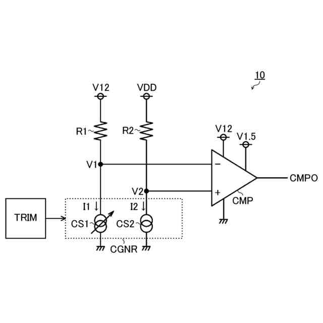 【解決手段】比較回路10は、第1電圧V1と第2電圧V2を比較して比較信号CMPOを生成するコンパレータCMPと、第1電流I1及び第2電流I2をそれぞれ生成する電流生成回路CGNRと、第1監視対象電圧V12の印加端と第1電圧V1の印加端との間に接続されて第1電流I1を第1電圧V1に変換する第1電流/電圧変換回路R1と、第2監視対象電圧VDDの印加端と第2電圧V2の印加端との間に接続されて第2電流I2を第2電圧V2に変換する第2電流/電圧変換回路R2と、第1電流I1と第2電流I2との差分値(I1-I2)を調整する調整回路TRIMと、を備える、