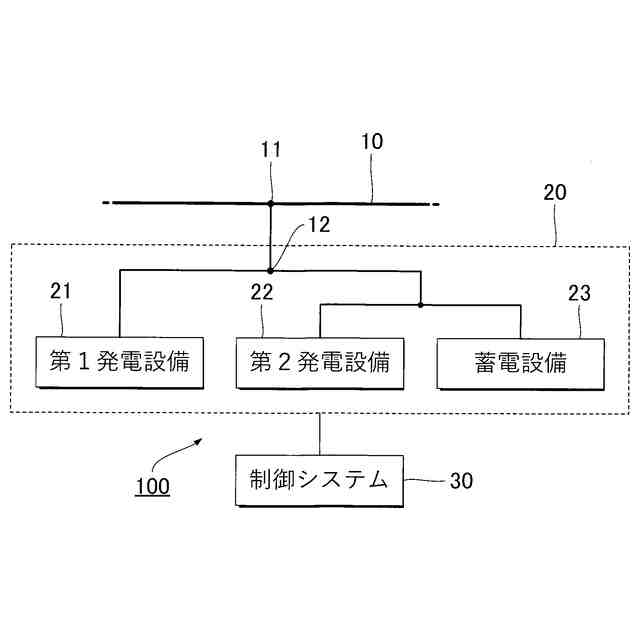 図1に例示される通り、電力システム100は、発電システム20と制御システム30とを具備する。発電システム20は、電力系統10に対して電力を供給する設備であり、連系点11において電力系統10に接続される。なお、実際には電力システム100と連系点11との間に変圧器等の電力設備が設置されるが、図1においては便宜的に図示が省略されている。制御システム30は、発電システム20による電力の供給を制御するコンピュータシステムである。制御システム30は、例えば専用線等の通信網(図示略)を介して発電システム20と通信可能である。