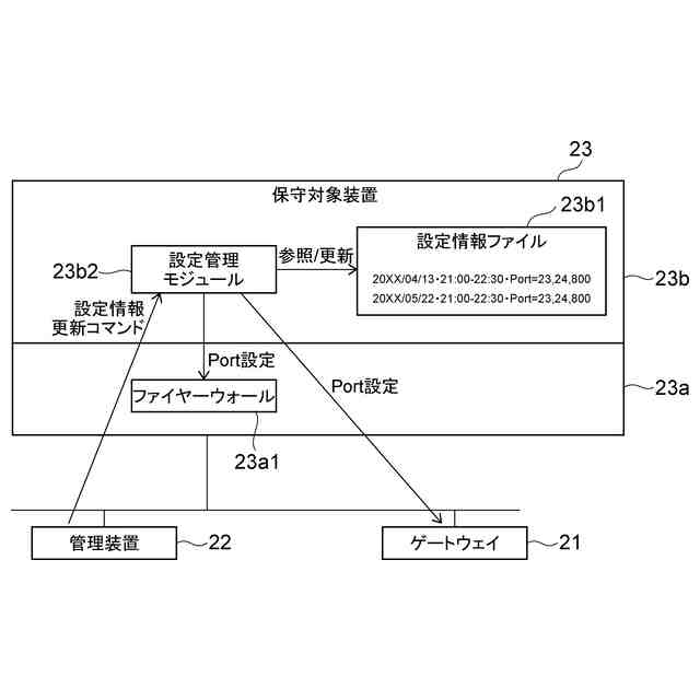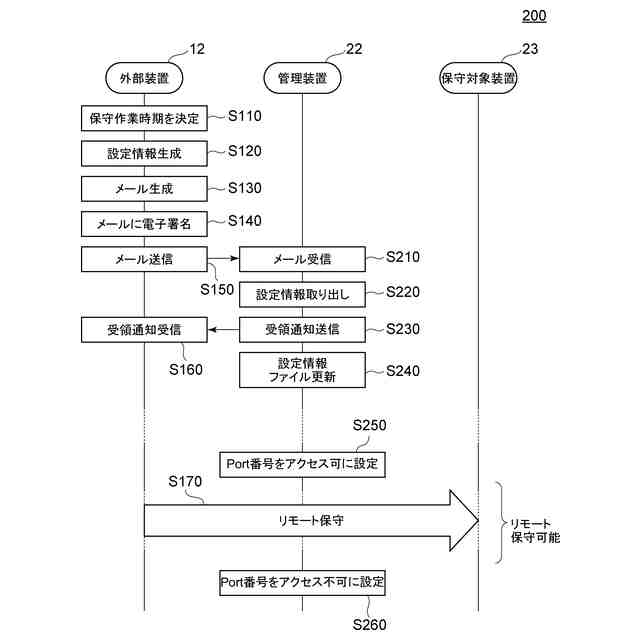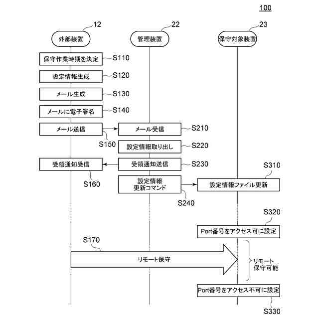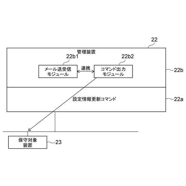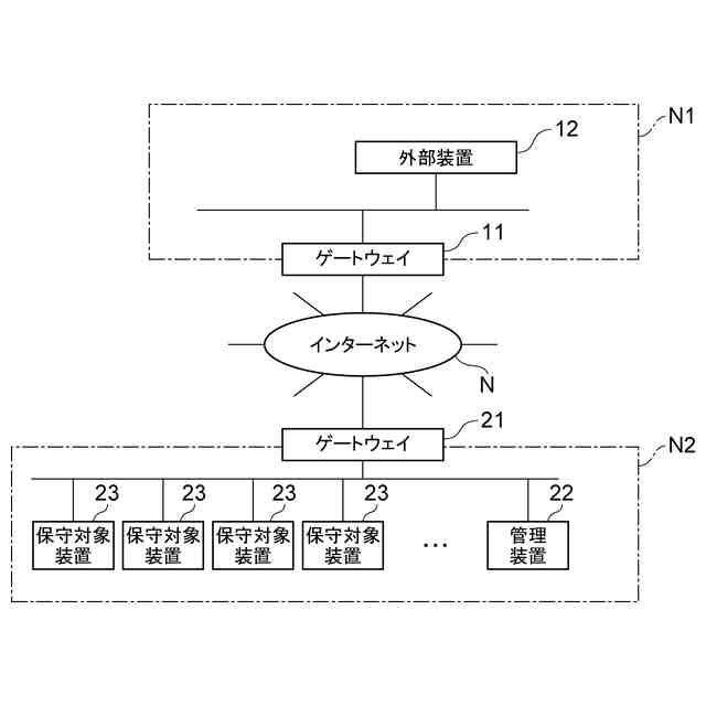 外部装置12は、一例として、保守管理システム100を運用する管理者によって利用される情報処理装置である。外部装置12は、保守対象装置23が配置されたローカルエリアネットワークN2のセキュリティ設定に関する電子メールを、ローカルエリアネットワークN2内の管理装置22に送信する。外部装置12の処理の詳細は後述する。