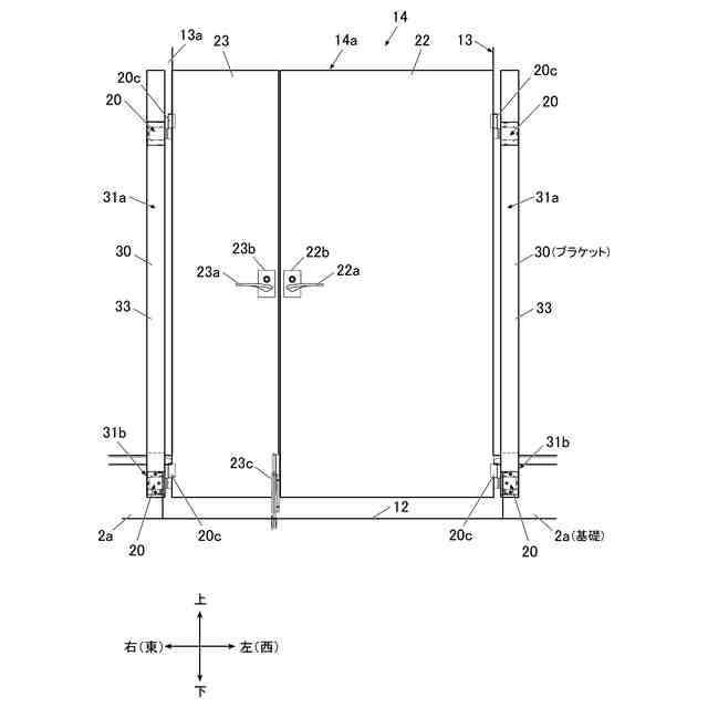 請求項3に記載の発明は、例えば図2~図6に示すように、屋外設置物(例えば門扉14a)を、基礎2aの上に構築された壁13a(例えば第一遮蔽壁13a)で支持するためのブラケット30であって、