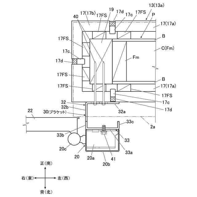 前記ブラケット30は、前記外装材17の表面よりも外側に配置されているとともに、固定部材40によって前記壁本体Pに対して固定されていることを特徴とする。