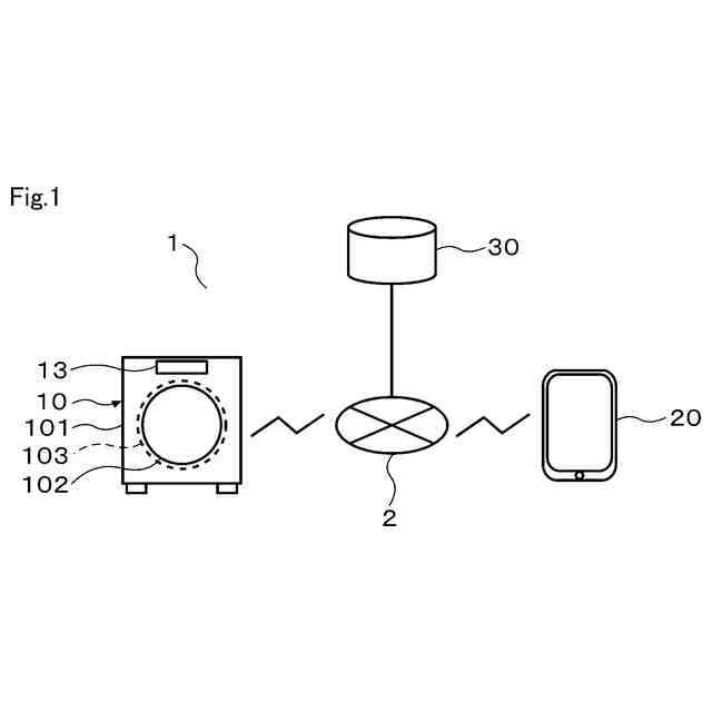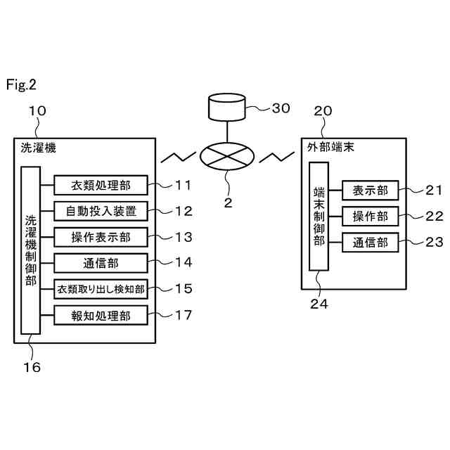 図1に示す衣類処理装置の一例である洗濯機10は、洗濯物に対して洗い、すすぎ、脱水、乾燥などの処理を施すことができる。洗濯機10は、例えば横軸又は斜め軸型のドラム式洗濯機である。洗濯機10は、縦軸型の洗濯機であっても良い。洗濯機10は、1つ又は複数の外部の装置20、30と通信可能に接続されて洗濯システム1を構成する。洗濯システム1は、衣類処理システムの一例である。洗濯システム1は、洗濯機10と外部の装置20、30とを、図示しないアクセスポイント及びネットワーク2などの電気通信回線を介して相互に通信可能に接続して構成されている。