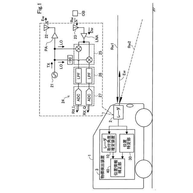 車両1に取り付けられている。したがって、放射波の進行方向(伝播する際の軸方向)は、水平方向と略平行となる。本実施形態では、この製造完了時点でのレーダ2の垂直取付角度は、「0度」である。すなわち、垂直取付角度が「0度」のときに、放射波の進行方向は水平方向と平行となる。物標検出装置3は、レーダ2により受信された反射波の受信強度を利用して、物標までの距離、車両1との物標との相対速度、および物標の方向を検出する。