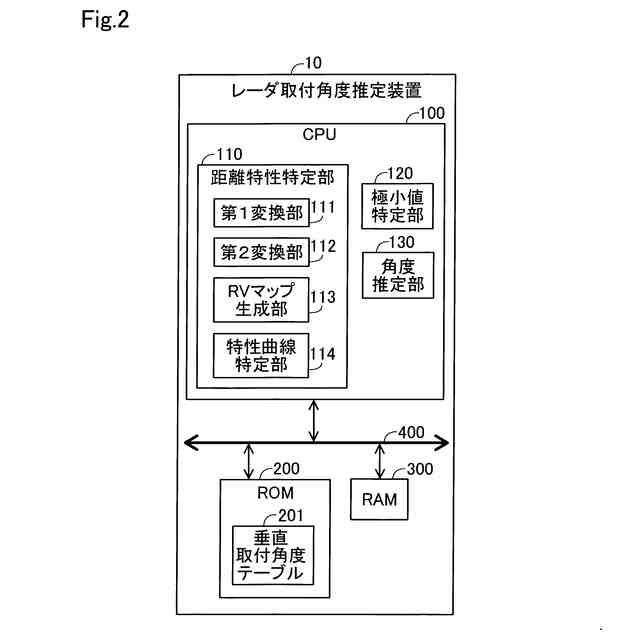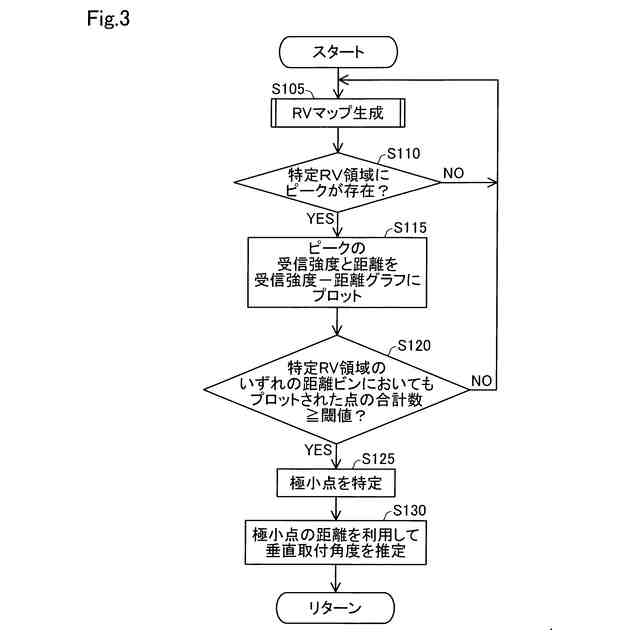 しかし、特許文献1の技術では、レーダの垂直取付角度のずれを検知できる一方、そのずれがどの程度であるかまでは特定できない。また、特許文献2の技術では、アスファルト表面の微細構造の種類によって反射波の受信強度が変わるため、レーダの垂直取付角度を正確に特定することはできない。このような問題から、レーダの垂直取付角度を精度良く推定可能な技術が望まれる。