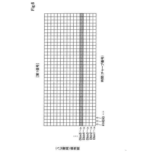 チャープ信号からなる前記放射波と、前記反射波の受信信号(Dw)と、が直交ミキサ(25)によりミキシングされることによって生成されるビート信号(Rx)を、周波数成分が距離ビン毎に表された第1信号にチャープ番号毎にフーリエ変換する第1変換部(111)と、