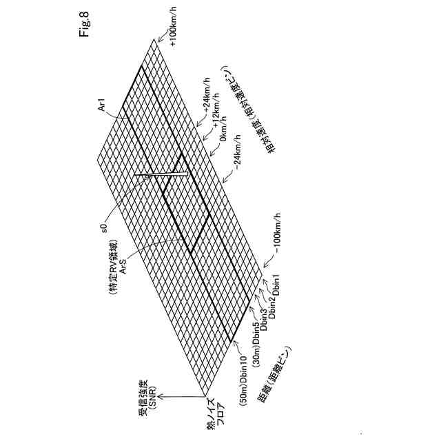 前記RVマップにおける領域であってゼロを含む予め定められた相対速度範囲に相当する前記相対速度ビン、且つ、前記特定距離範囲に相当する前記距離ビンからなる領域である特定RV領域(ArS)内に前記ピークが存在する場合には、該ピークの前記受信強度および該ピークの前記距離ビンが示す距離を、前記受信強度-距離グラフにプロットし、